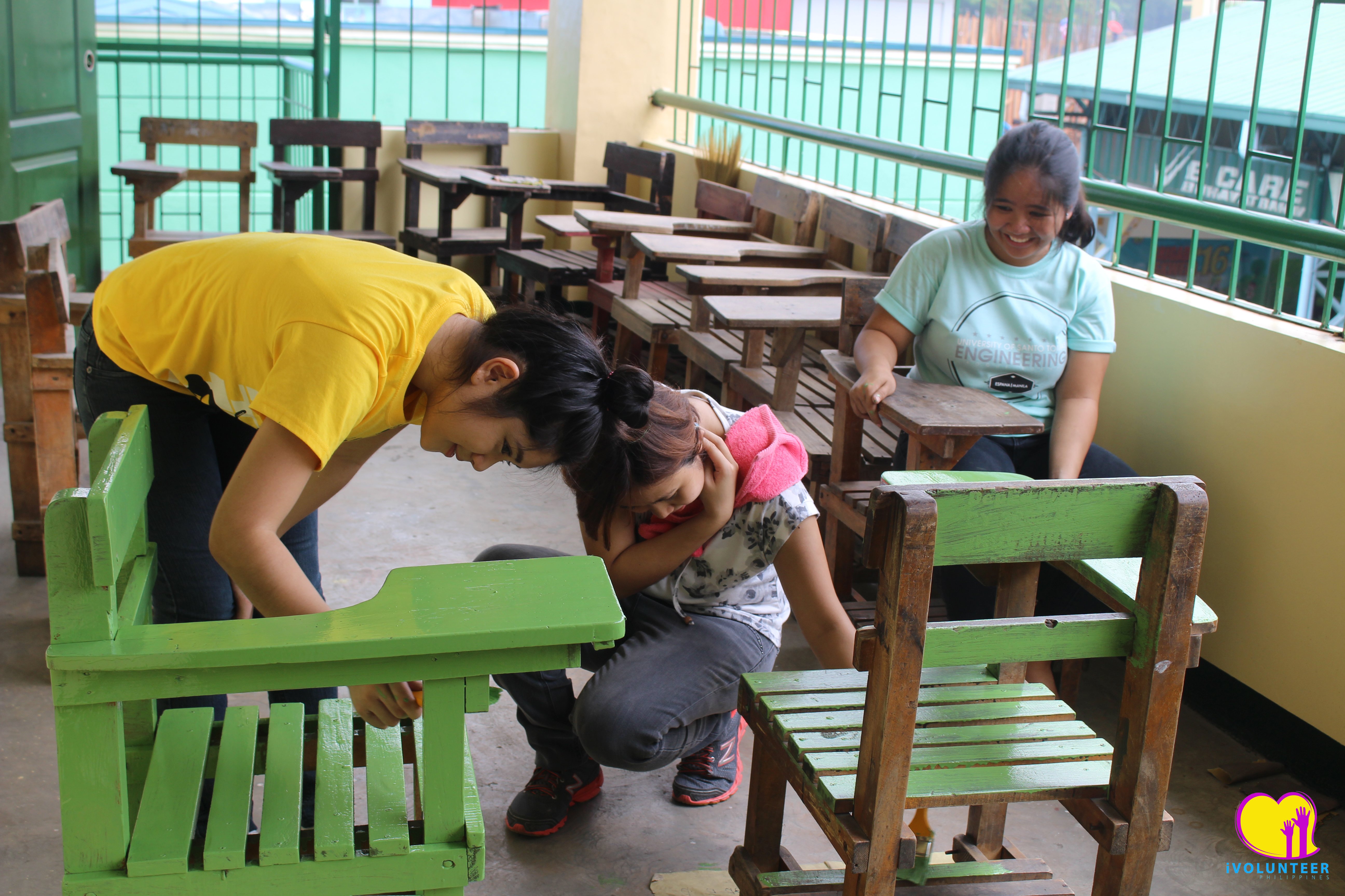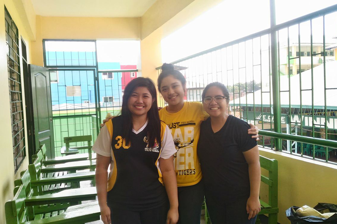 (Eden Rose Hernandez, Aljenica Ocampo, and Katleen Ramos, Education students and aspiring teachers, helping out in painting classroom chairs)