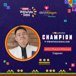 John Mauro Manuel, a 30-year-old teacher from Cagayan Valley, was awarded as the 2021 Volunteer Champion for Professionalism. Volunteers who champion professionalism are those who go beyond what is expected of their given role, and exceptionally deliver their duties and commitments, all while showing respect for their advocacy, their peers and the community that they serve. They volunteer with the mindset of delivering the best.
