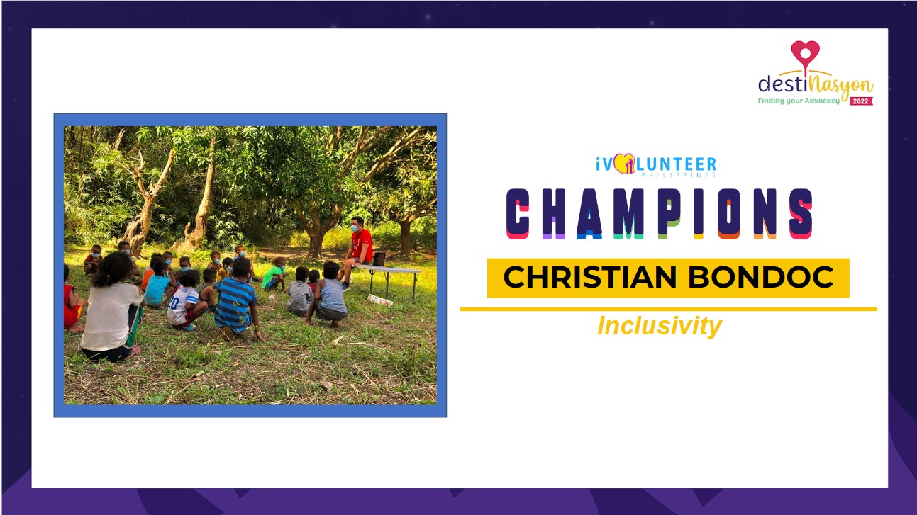 The 2022 iVolunteer Champion for Inclusivity is Christian Bondoc, a Human Resource Manager in Tarlac City who is a staunch animal welfare advocate. Apart from his love for animals, he is interested in farming and learning about other cultures. Volunteers like Christian, who advocate for inclusivity, give voice to the helpless, and in doing so, they help pave the way for equal access to opportunities.